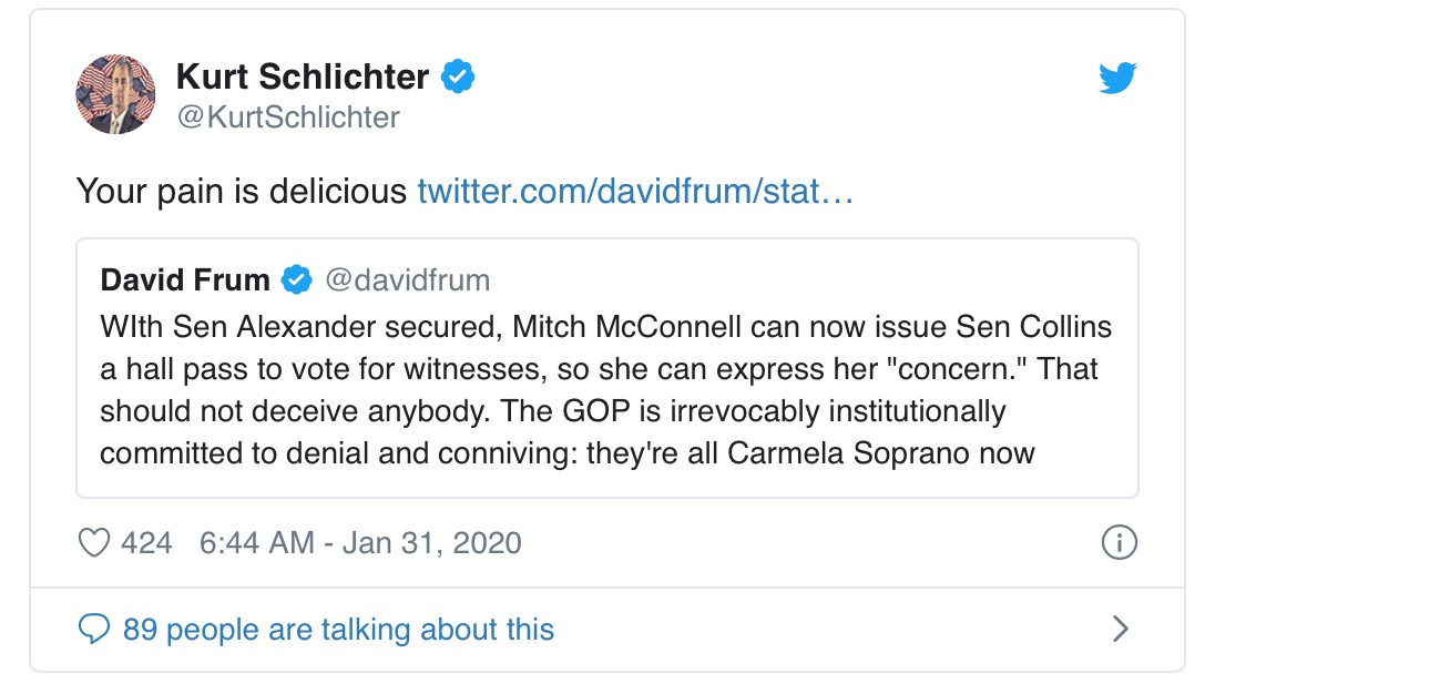 The over-the-top rhetoric might play well among the Resistance😁. But out here in the real world where nobody gives a tinker’s fart about this shampeachment, it’s easily dismissed as just more outrage from the perpetually outraged.