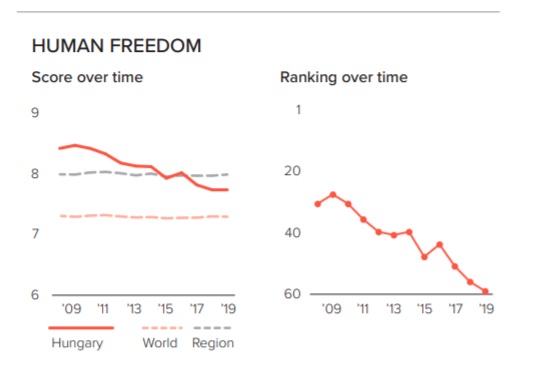 But the decline in freedom in the United States is nothing compared to what has happened in Hungary—a country now routinely (and wrongly) held up by segments of the nationalist right as an example that America should seek to emulate. Hungary ranks 59th in this year's index, down from a high of 29th in 2009. Recent efforts by strongman dictator Viktor Orbán to curtail freedom of expression and erode the rule of law are clearly reflected in the ratings, with Hungary now ranking considerably less free than its European neighbors: