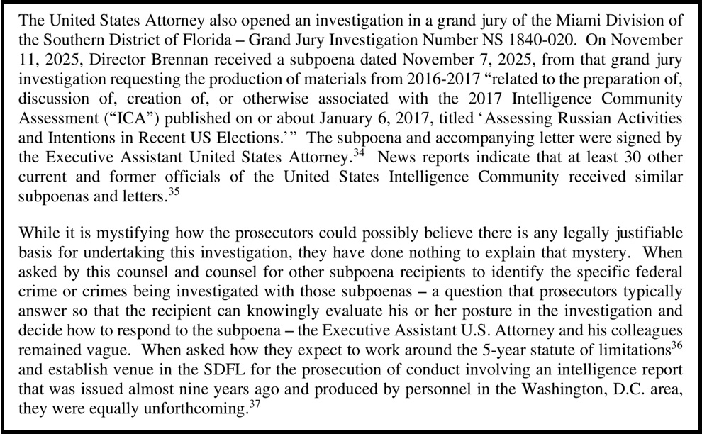 The word “target” is important here, because the letter specifically outlines how Brennan has received subpoenas for documents and information surrounding his construct of the 2017 Intelligence Community Assessment.