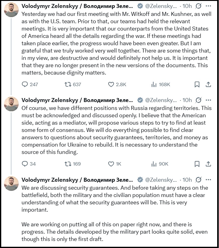 (1) The primary objective of Ukraine/EU has been a publicity campaign to retain influence and support. (2) U.S. Emissaries Witkoff and Kushner are silent on the announced negotiated result. (3) Ukraine’s lead negotiator Rustem Umerov notes, “There is a lot of noise and anonymous speculation in the media right now. Please don’t fall for rumors and provocations. The American team led by Steve Witkoff and Jared Kushner are working extremely constructively to help Ukraine find a way to a peace agreement that lasts.”
