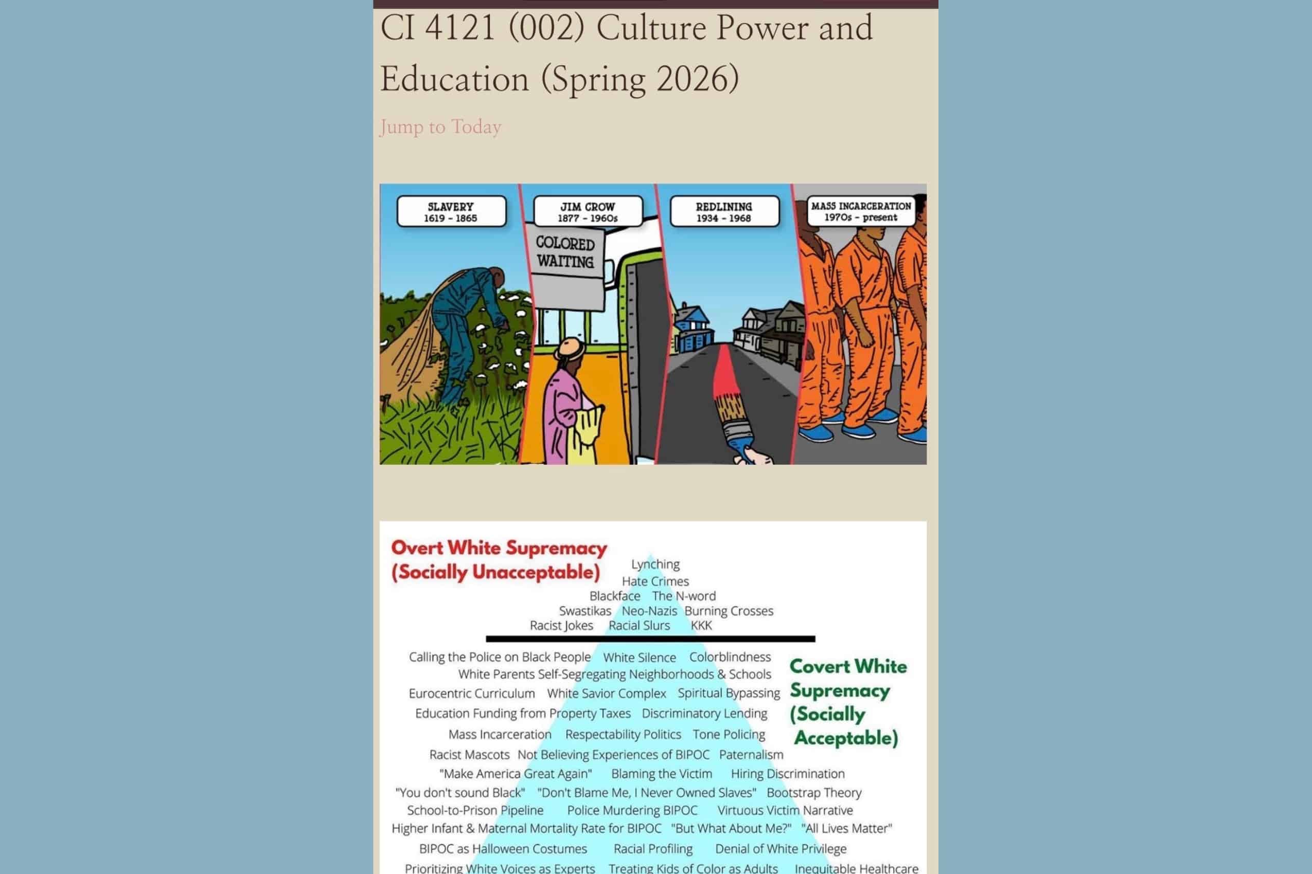 Angela also noted the “Culture, Power, and Education” class page included a pyramid with examples of “overt” and “covert” white supremacy.