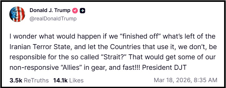 Sometimes things are just too funny. Less than 24 hours after President Trump said Europe’s refusal to escort their own oil shipments through the Strait of Hormuz might lead him to reconsider staying in NATO, suddenly ships are en route.