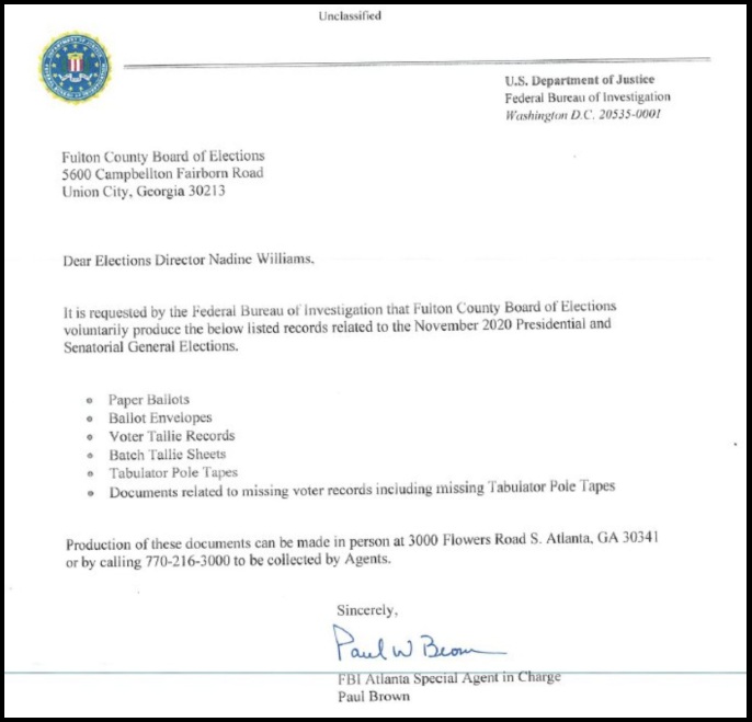 Meanwhile there was some media controversy about the FBI Special Agent in charge of the Atlanta Field office being removed from his position just prior to the execution of a federal search warrant in Fulton County. The reason for that removal now seems to come to light with the release of letter former Agent Paul Brown sent to Elections Director Nadine Williams giving her a head’s-up on the material the FBI was going to seize.